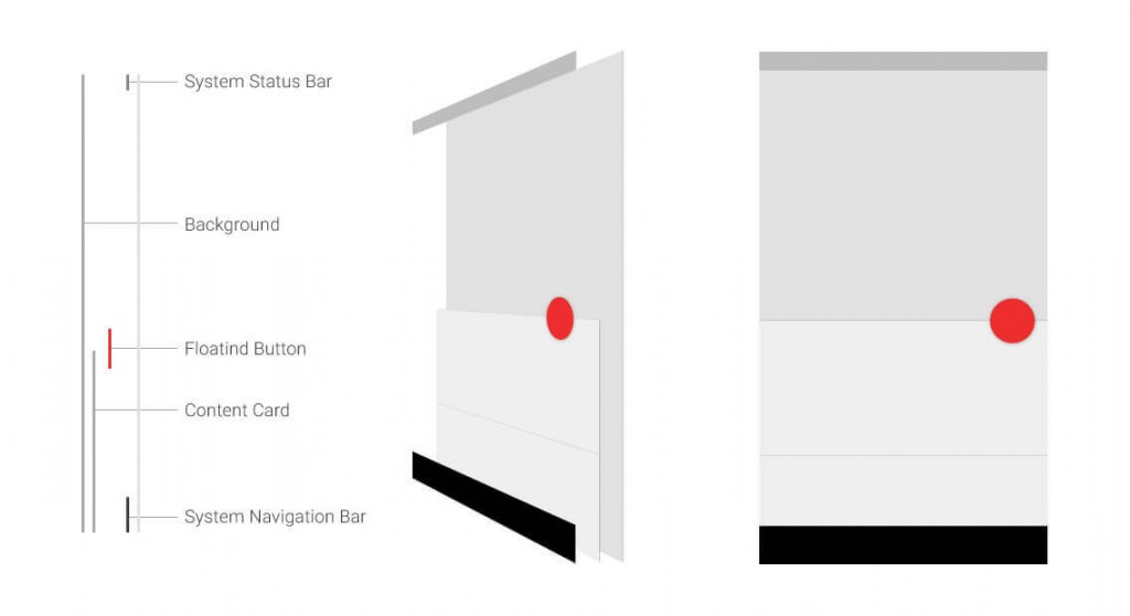 Ogni elemento dell’interfaccia grafico diventa una superficie tangibile, tutte le superfici hanno lo spessore di 1dpi, così facendo acquisiscono delle ombre realistiche che creano un ordine gerarchico, uno sopra l’altro andando a migliorare l’esperienza utente e l’identificabilità dei singoli elemento.