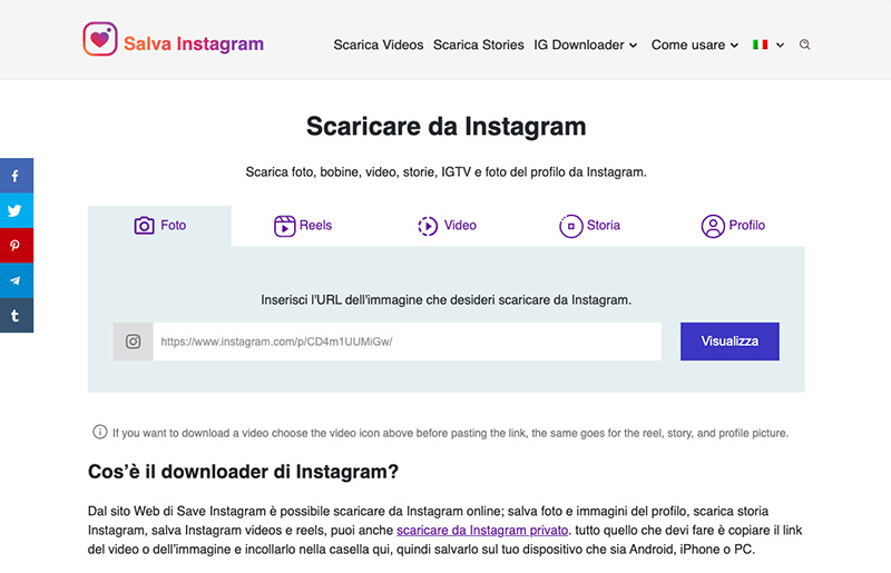Una volta scelto se scaricare foto, video, reels o storie dal menù, vi basterà incollare il link di vostro interesse nella barra del sito e cliccare su “visualizza”. In pochi secondi verranno estratti i contenuti scelti e avrai la possibilità di scaricarli con un semplice click. Nel caso si post con più contenuti, questi saranno suddivisi e scaricabili singolarmente.